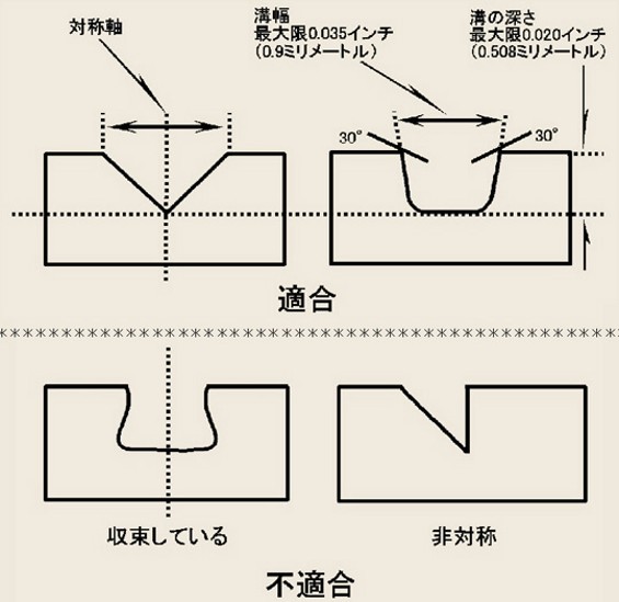 先ず溝幅は0.9mm以下でならなければいけない、溝の深さは0.508以下でなくてはいけない、溝の底部は終息してはいけない、これが原則ですが誤差範囲(供用範囲)は0.05mmの誤差範囲を認めています?